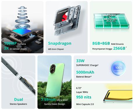 Realme C67 4G ma 6,72-calowy wyświetlacz LCD o rozdzielczości FHD+ i częstotliwości odświeżania 90 Hz. Panel ma otwór na przedni aparat 8 MP. Główny ma podwójne czujniki 108 MP (Samsung ISOCELL HM6) + 2 MP. Gadżet jest zasilany baterią o pojemności 5000 mAh. Obsługuje ona ładowanie 33W. Nowość ma stopień ochrony przed wodą i brudem IP54, a także zamontowany z boku skaner linii papilarnych. Za wydajność urządzenia odpowiada ośmiordzeniowy procesor Snapdragon 685. Po wyjęciu z pudełka realme C67 4G działa pod kontrolą systemu operacyjnego Android 14 z realme UI 4.0.
