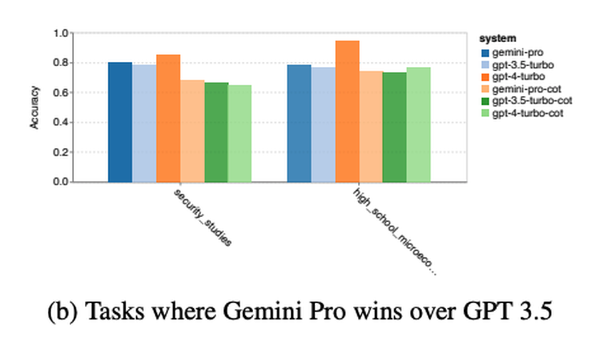 Podczas testowania modeli w różnych zadaniach, w tym w pytaniach wielokrotnego wyboru z różnych dziedzin i zadaniach logicznych, Gemini Pro wypadł gorzej niż GPT-3.5 Turbo. Opóźnienie było szczególnie znaczące w obszarach takich jak matematyka, programowanie i przetwarzanie długich, złożonych zapytań.