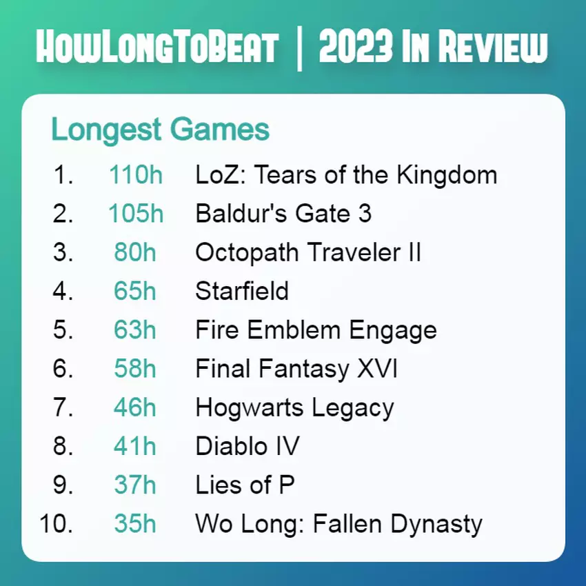 Liderzy nie zaskoczyli: były to niezwykle rozbudowane projekty The Legend of Zelda: Tears of the Kingdom i Baldur's Gate III. Ich ukończenie zajmuje średnio odpowiednio 110 i 105 godzin.