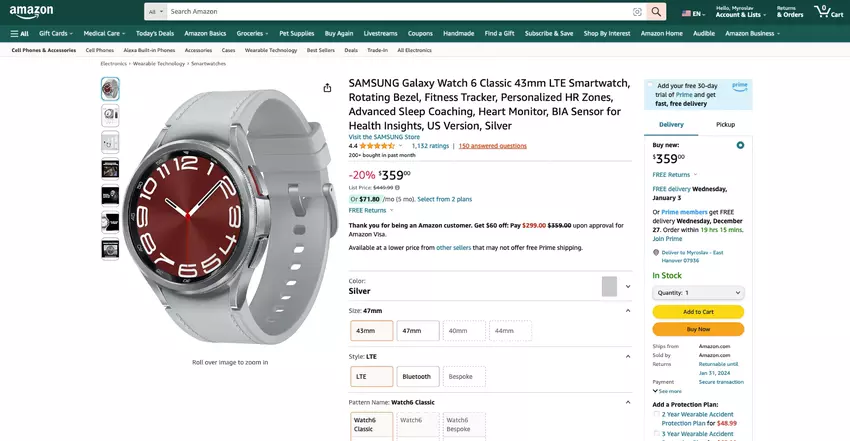 Model z kopertą 43 mm i obsługą LTE jest teraz dostępny na Amazon za $349.99 $449.99, -22%. Dostępne są dwa kolory: Czarny i Srebrny.