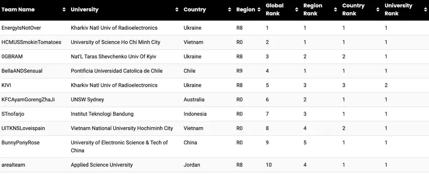 W pierwszej piątce znalazły się 3 drużyny, w tym 2 z Charkowskiego Narodowego Uniwersytetu Radioelektroniki