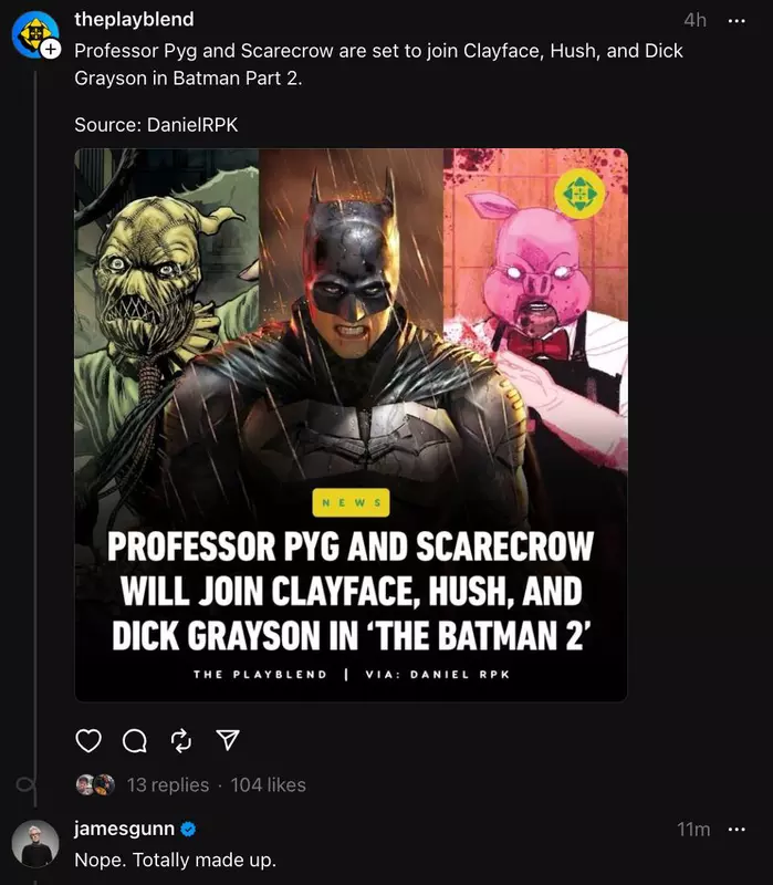 Niedawne plotki o pojawieniu się Husha, Clayface'a i innych postaci w sequelu "Batmana" DC wzbudziły duże zainteresowanie i oczywiście James Gunn nie mógł pozostać z boku i ma zamiar zdusić niektóre z nich.
