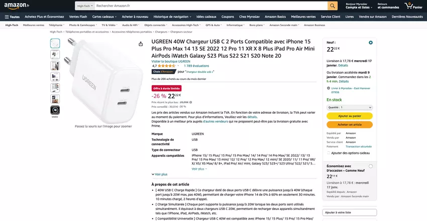 Mowa o ładowarce UGREEN za check price on amazon. Urządzenie ma dwa porty USB-C i łączną moc wyjściową 40 W (20 W na port). Ładowarka jest kompatybilna ze smartfonami Apple, Samsung, Google i innych producentów. Przykładowo, może naładować iPhone'a 14 od 0 do 60% w 30 minut.