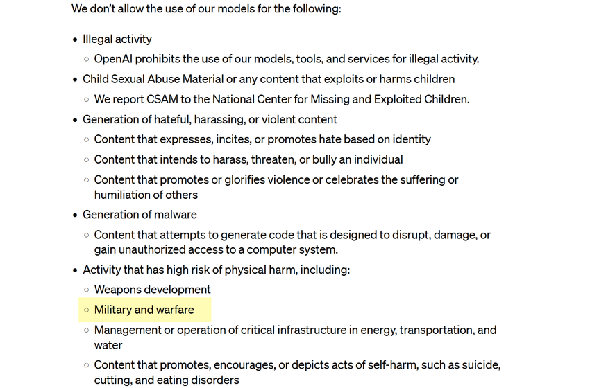 Firma OpenAI wprowadziła niezapowiedziane zmiany w polityce dotyczącej korzystania z jej produktów. W szczególności z dokumentu wyłączono bezpośredni zakaz wykorzystywania chatbotów i innych rozwiązań do celów wojskowych.