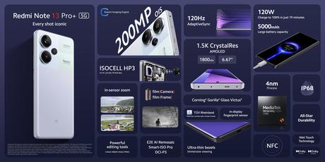 Nowość wyposażona jest w aparat główny o rozdzielczości 200 MP + 8 MP + 2 MP. Głównym modułem jest Samsung ISOCELL HP3. Rozdzielczość aparatu do selfie wynosi 16 MP. Redmi Note 13 Pro+ posiada również głośniki stereo, port IR, Wi-Fi 6 i NFC. Korpus jest odporny na wodę i kurz zgodnie z normą IP68.