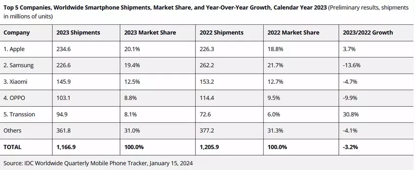 Według wstępnych danych firmy badawczej IDC, zgodnie z wynikami z 2023 roku, sytuacja na globalnym rynku smartfonów uległa zmianie, a Samsung nie jest już stałym liderem.