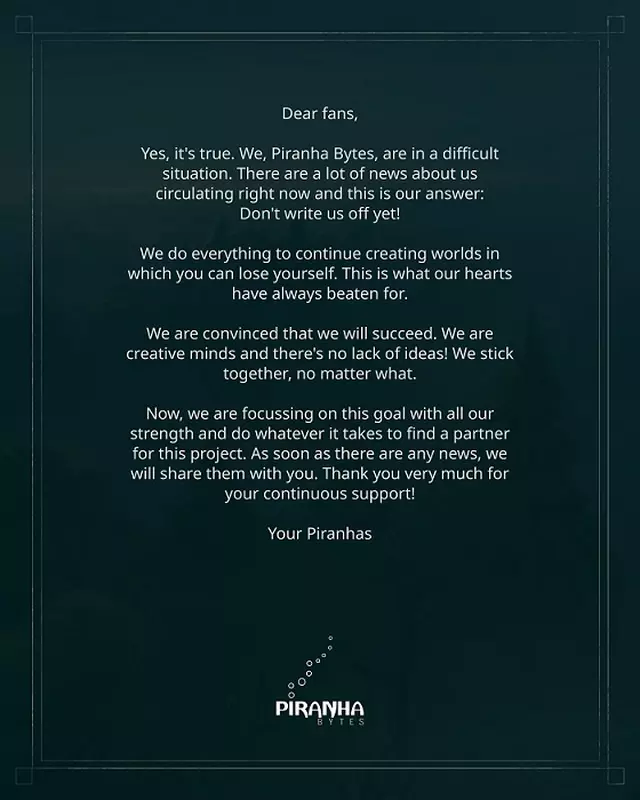 Przedstawiciele Piranha Bytes opublikowali apel do graczy, w którym namawiają, by "nie spisywać ich na straty" ©. Deweloperzy przyznali, że znajdują się w trudnej sytuacji, ale podkreślili, że nadal pracują i ani myślą przestać. Piranha Bytes ma wiele kreatywnych pomysłów, które mają nadzieję zrealizować w kolejnym projekcie.
