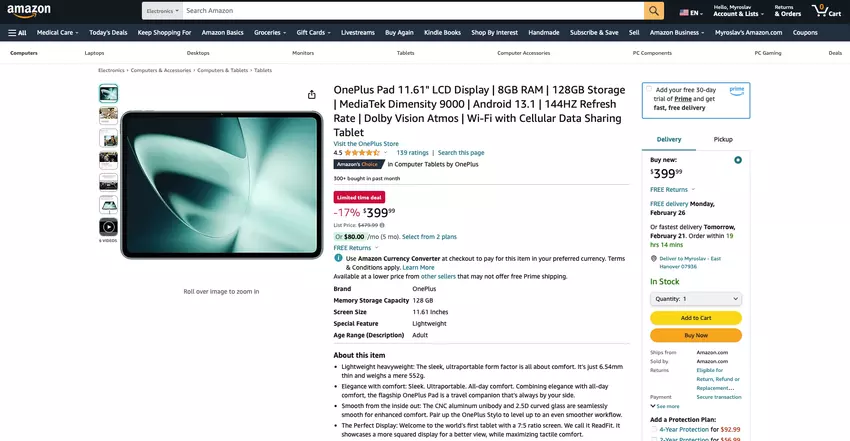OnePlus Pad jest teraz dostępny na Amazon za $382.25 dolarów - $382.25. Dostępny jest tylko jeden kolor i jedna modyfikacja pamięci - 8/128 GB.