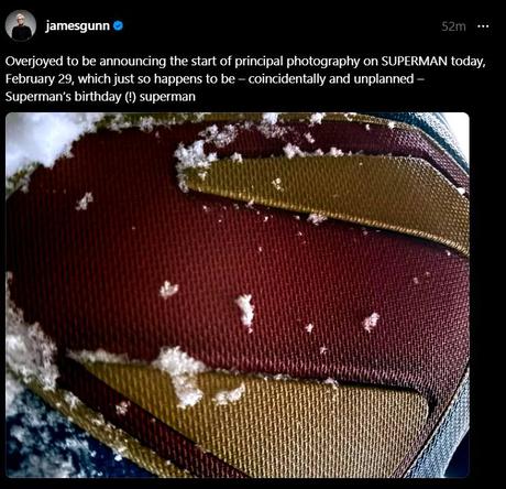 "Jestem bardzo podekscytowany, że mogę ogłosić rozpoczęcie zdjęć do filmu o Supermanie dzisiaj, 29 lutego, który przypadkowo jest również dniem urodzin Supermana! Kiedy ukończyłem pierwszy szkic scenariusza, nazwałem go Superman: Legacy. Do czasu ukończenia ostatecznego szkicu było jasne, że tytuł będzie brzmiał po prostu SUPERMAN. Z niecierpliwością czekamy na lipiec 2025 roku. Wszystkiego najlepszego, Clark!", napisał Gunn.