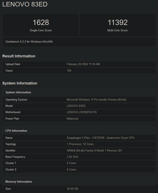 Laptop Lenovo o nazwie kodowej Lenovo 83ED uzyskał odpowiednio 1628 i 11 392 punktów w testach jednordzeniowych i wielordzeniowych Geekbench 6.2. To znacznie niższe wyniki niż te, które Qualcomm odnotował w swoich testach (2,777/14,056 przy 23W i 2,966/15,239 przy 80W). Nie wiadomo z jaką mocą pracuje ten układ, ale ma on konfigurację 8+4 rdzenie.
