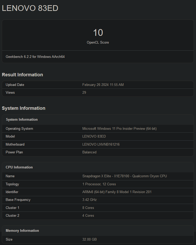 Laptop Lenovo wyposażony jest również w nieznany procesor graficzny Adreno, który również wypadł słabo w testach Geekbench OpenCL, zdobywając zaledwie 10 punktów. Laptop ma 32 GB pamięci RAM i działa na systemie Windows 11 Pro Insider Preview.