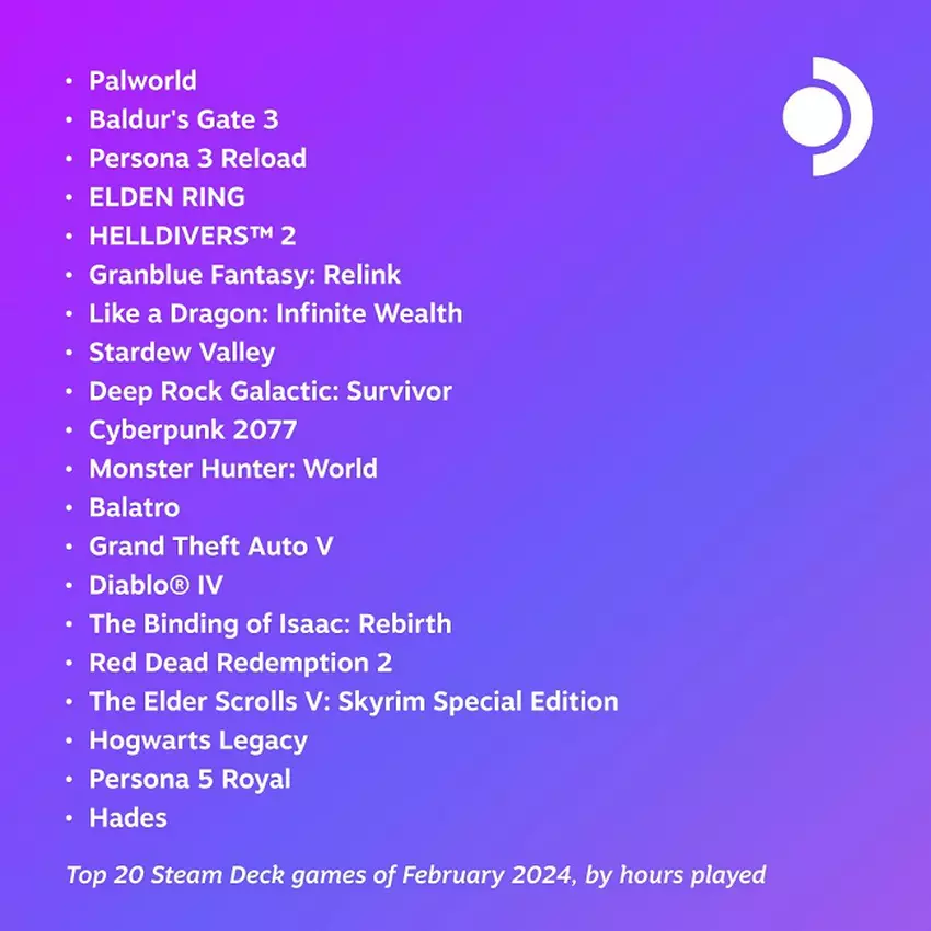 Top 20 najpopularniejszych gier na Steam Deck w lutym 2024 roku wygląda następująco: