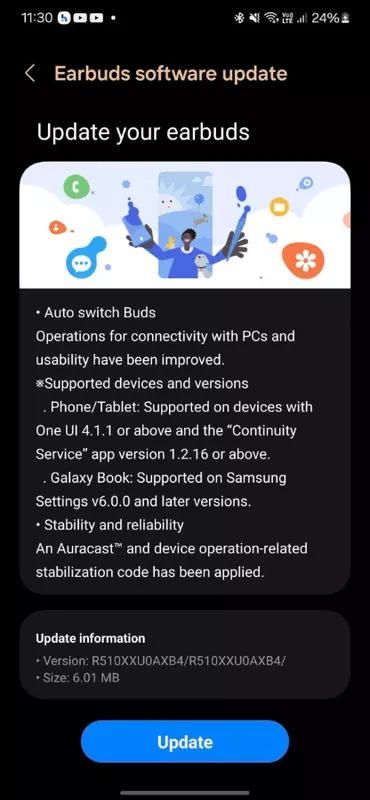 Aktualizacja wprowadza funkcję Buds Auto Switch do automatycznego parowania słuchawek bezprzewodowych z laptopami i komputerami Galaxy. Funkcja ta powinna działać z laptopami z serii Galaxy Book 3 i Galaxy Book 4. Nowa funkcja wymaga smartfona z One UI 4.1.1 (lub nowszym) i aplikacją Continuity Service (wersja 1.2.16 lub nowsza). Galaxy Book musi mieć również zainstalowaną aplikację Samsung Settings (wersja 6.0.0.0 lub wyższa).
