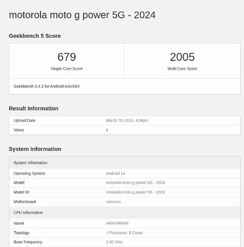 Niestety, nie ma żadnych innych szczegółów na temat Moto G Power 5G (2024) w Geekbench, ale jeśli wierzyć wcześniejszym przeciekom, gadżet będzie również wyposażony w 6,7-calowy ekran LCD. Smartfon otrzyma port ładowania USB-C i gniazdo słuchawkowe 3,5 mm. Nowość będzie dostarczana w obudowie o wymiarach 167,3×76,4×8,5 mm.