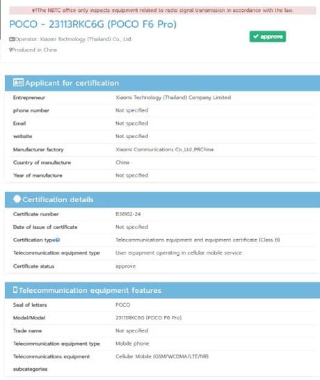 Mowa o modelu POCO F6 Pro. Nowość została zauważona w bazie danych tajlandzkiej agencji certyfikującej NBTC z numerem modelu 23113RKC6G. Oznacza to, że wydanie gadżetu nastąpi w najbliższej przyszłości.