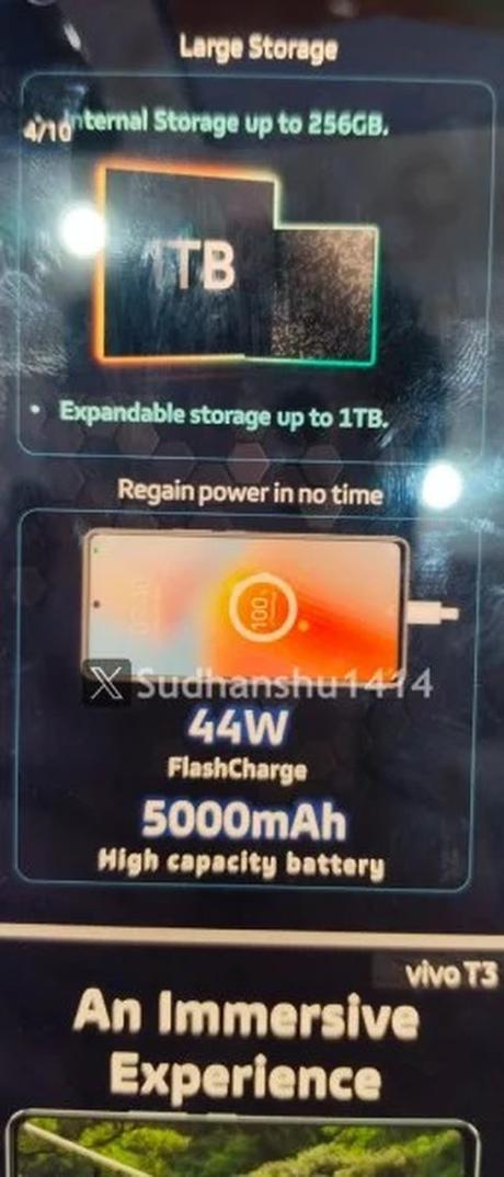 Vivo T3 będzie dostępny z 8 GB pamięci RAM oraz w konfiguracjach z 128 GB i 256 GB wbudowanej pamięci masowej. Telefon będzie również wyposażony w rozszerzoną pamięć RAM 3.0, która przydzieli do 8 GB pamięci masowej jako rozszerzoną pamięć RAM.