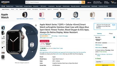 Oferta ograniczona czasowo: Apple Watch Series 7 z obsługą urządzeń mobilnych i kopertą ze stali nierdzewnej dostępny na Amazon ze zniżką 78 USD
