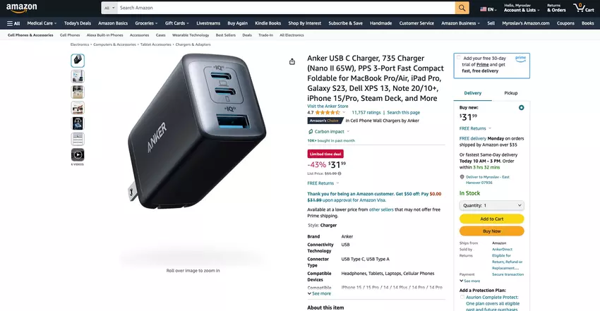Ładowarka Anker 735 Charger Nano II z trzema portami i mocą 65 W jest dostępna na Amazon w cenie 31,99 USD (43% taniej).