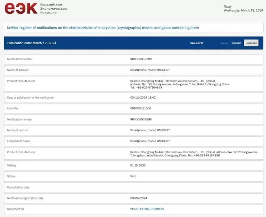 Smartfon otrzymał numer modelu RMX3997. Wcześniej certyfikacja Bluetooth SIG potwierdziła wsparcie dla standardów Bluetooth 5.3, podczas gdy certyfikacja TUV Rheinland wskazuje na baterię 4,890mAh z obsługą szybkiego ładowania 15W.