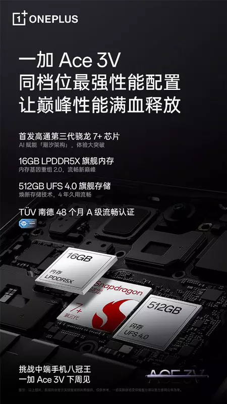 W nowym plakacie marka potwierdziła najwyższą konfigurację urządzenia. OnePlus twierdzi, że Ace 3V będzie miał najpotężniejszą konfigurację sprzętową w swoim segmencie cenowym, ponieważ będzie wyposażony w chipset Snapdragon 7+ Gen 3, 16 GB pamięci RAM LPDDR5x i 512 GB pamięci UFS 4.0.