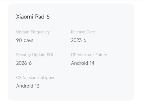 Zarchiwizowana wersja (20 października 2023 r.) strony internetowej Centrum Bezpieczeństwa Xiaomi potwierdza, że Xiaomi Pad 6 miał otrzymać zarówno Androida 14, jak i Androida 15. Jednak aktualna wersja (16 marca 2024 r.) całkowicie usunęła Androida 15 bez żadnego wyjaśnienia. Xiaomi pozostawiło informację, że tablet otrzyma tylko Androida 14.