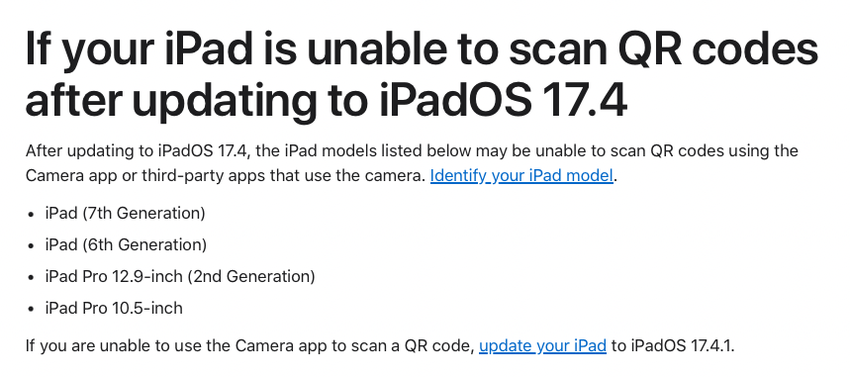 Apple z aktualizacją iPadOS 17.4.1 naprawił błąd skanowania kodów QR w iPadzie