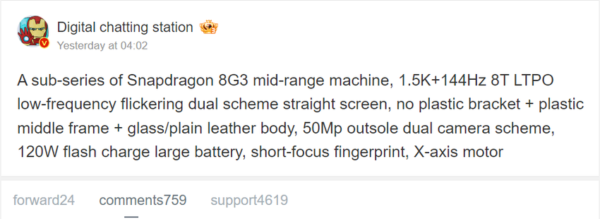 Według danych chińskiego insidera Digital Chat Station, nowość będzie wyposażona w procesor Snapdragon 8 Gen 3. Ponadto urządzenie otrzyma ekran LTPO OLED o rozdzielczości 1,5K i częstotliwości odświeżania 144 Hz. Według doniesień, urządzenie będzie miało plastikową ramkę i tylny panel wykonany ze szkła lub sztucznej skóry, w zależności od wersji kolorystycznej. Główny aparat urządzenia będzie miał rozdzielczość 50 MP.