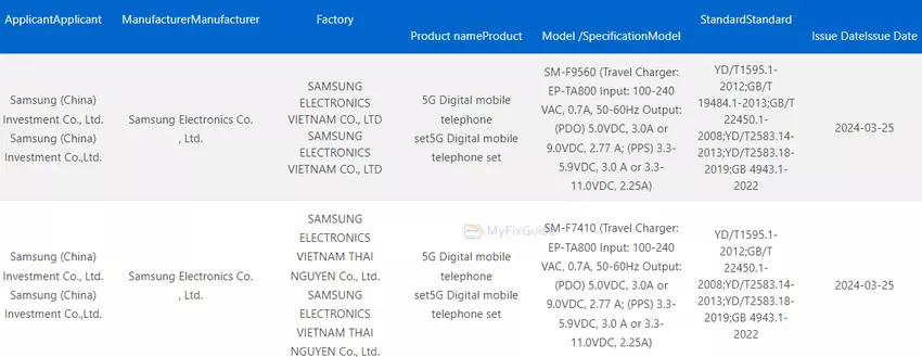 Certyfikat wskazuje, że oba te modele będą korzystać z tej samej ładowarki Samsung EP-TA800, która ma maksymalną moc 25W. Firma używa jej od dłuższego czasu w swoich flagowcach, a także niektórych modelach ze średniej półki. Poprzednia generacja Galaxy Fold 5 i Galaxy Flip 5 korzystała z tej samej ładowarki.