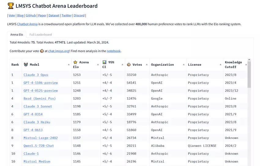 Duży model językowy Claude 3 Opus firmy Anthropic po raz pierwszy przewyższył GPT-4 OpenAI w Chatbot Arena, popularnym rankingu crowdsourcingowym wykorzystywanym przez naukowców do oceny możliwości modeli językowych AI.