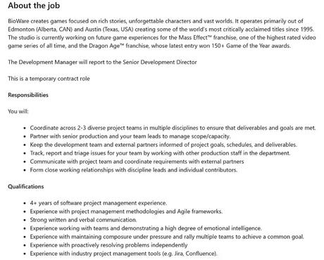 Na swojej stronie LinkedIn BioWare opublikowało ogłoszenie o naborze na tymczasowego kierownika produkcji, który będzie musiał zapewnić koordynację na kilku frontach 2-3 zespołów projektowych, aby zapewnić realizację zadań i celów.
