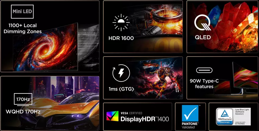 Nowy monitor od TCL jest również testowany Pantone i fabrycznie kalibrowany, aby zapewnić dokładne odwzorowanie kolorów. Dzięki 1152 strefom podświetlenia Mini LED, monitor osiąga szczytową jasność HDR 1600 nitów, uzyskując certyfikat VESA DisplayHDR 1400.