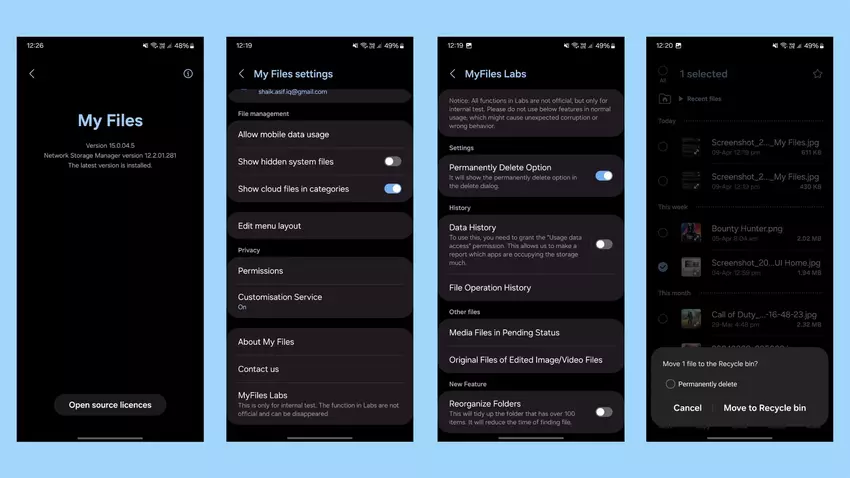 Funkcja ta znajduje się w ukrytym menu o nazwie MyFiles Labs. Po aktywacji tej funkcji w menu kontekstowym podczas usuwania plików pojawia się dodatkowa pozycja. Jeśli wybierzesz tę opcję, plik zostanie trwale usunięty z telefonu i nie będziesz musiał przechodzić do sekcji Kosz, aby go trwale usunąć.