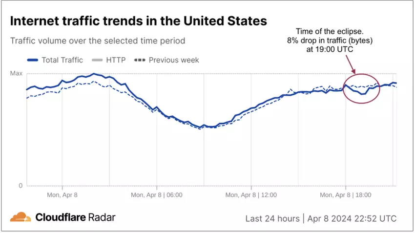 W dniu 8 kwietnia, podczas całkowitego zaćmienia Słońca w Stanach Zjednoczonych i Kanadzie, aktywność internetowa gwałtownie spadła, ponieważ ludzie wyszli na zewnątrz, aby obserwować to naturalne zjawisko. Według Cloudflare, dostawcy infrastruktury internetowej, ruch internetowy w tych regionach zmniejszył się na kilka minut podczas zaćmienia.