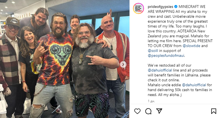 "MINECRAFT SIĘ KOŃCZY! Pozdrawiam całą ekipę i obsadę. Niesamowite doświadczenie filmowe i naprawdę jeden z najwspanialszych okresów w moim życiu. Mnóstwo śmiechu. Kocham ten kraj. AOTEAROA Nowa Zelandia, jesteś magiczna. Dziękuję, że mogłem tu kręcić" - napisał Momoa pod karuzelą zdjęć.