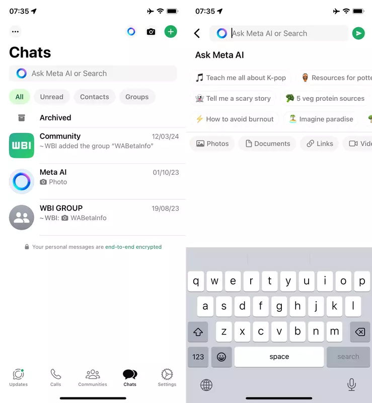 Należy zauważyć, że chatbot Meta będzie działał niezależnie i nie będzie powiązany z korespondencją użytkowników w WhatsApp. Meta AI jest obecnie zintegrowana z paskiem wyszukiwania w górnej części aplikacji. Wszystko, co użytkownicy wpisują na pasku wyszukiwania, pozostaje prywatne, dopóki użytkownik nie wyśle zapytania do chatbota Meta. Oprócz możliwości wyszukiwania określonych treści w rozmowach, pasek wyszukiwania umożliwia teraz użytkownikom bezpośredni kontakt z chatbotem Meta AI.