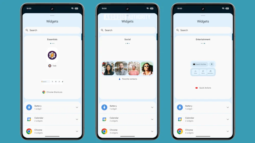 Ponadto Pixel Launcher poprawia rekomendacje widżetów w systemie Android 15. W obecnej wersji, po otwarciu selektora widżetów w Pixel Launcher, losowy widżet pojawia się na górze strony. Nowy system rekomendacji oferuje więcej opcji do wyboru, a także kategoryzuje rekomendacje według typu, ułatwiając znalezienie odpowiedniego widżetu.