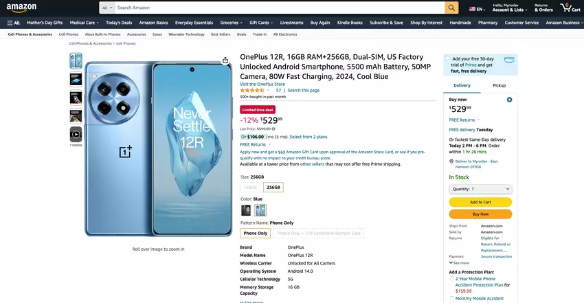 Mówimy o OnePlus 12R z 256 GB pamięci masowej. Gadżet został wyceniony na check price on amazon. Dostępne są dwa kolory, szary i niebieski.