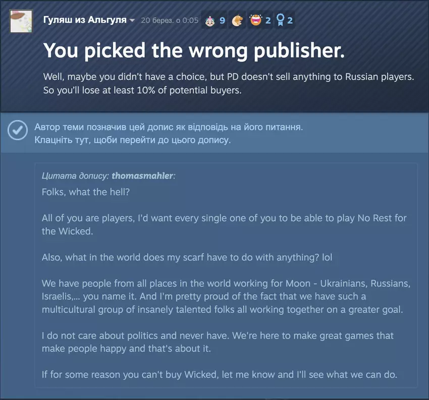 Thomas Miller odpowiedział graczowi w następujący sposób: "Chłopaki, co do cholery? Wszyscy jesteśmy graczami, chciałbym, żeby każdy mógł zagrać w No Rest for the Wicked... W Moon pracują ludzie z całego świata - Ukraińcy, Rosjanie, Izraelczycy... I jestem dumny z faktu, że tak wielokulturowa grupa niezwykle utalentowanych ludzi pracuje razem dla wielkiej sprawy. Polityka mnie nie obchodzi i zawsze obchodziła. Jesteśmy tu po to, by tworzyć świetne gry, które uszczęśliwiają ludzi i tyle. Jeśli z jakiegoś powodu nie możesz kupić Wicked, daj mi znać, a zobaczę, co mogę z tym zrobić".