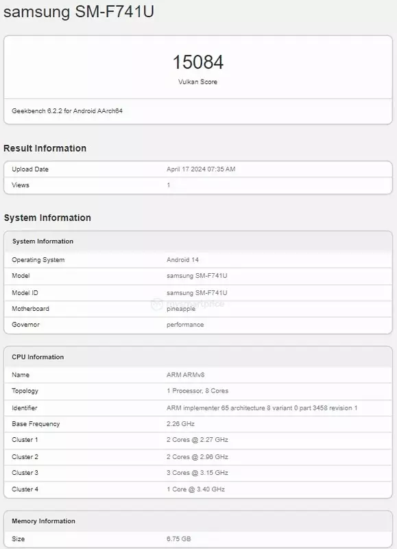 Urządzenie o numerze modelu SM-F741U wykazało się doskonałymi wynikami w teście Vulkan, zdobywając 15 084 punktów. Testowany smartfon wyposażony jest w ośmiordzeniowy procesor Qualcomm Snapdragon 8 Gen 3, który został specjalnie zaprojektowany dla Galaxy. Jest to ulepszona wersja chipsetu Snapdragon 8 Gen 3 ze zwiększoną prędkością zegara. Procesorowi towarzyszy 8 GB pamięci RAM.
