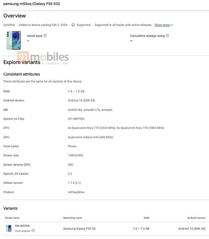 Według Google Play, Galaxy F55 posiada wyświetlacz o rozdzielczości Full HD+, procesor Snapdragon 7 Gen 1, 8 GB pamięci RAM i obsługę 5G. Urządzenie działa na systemie operacyjnym Android 14, prawdopodobnie z niedawno wydanym One 6.1. Te specyfikacje wskazują, że Galaxy F55 będzie przemianowaną wersją Galaxy M55.