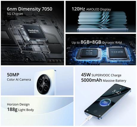 Smartfon ma ten sam wygląd, ale inną specyfikację. Urządzenie zostało wyposażone w wyświetlacz AMOLED. Panel ma rozdzielczość Full HD +, częstotliwość odświeżania 120 Hz i szczytową jasność 2000 nitów. Nowość jest napędzana procesorem MediaTek Dimensity 7050 i zasilana baterią o pojemności 5000 mAh. Gadżet obsługuje ładowanie 45W.