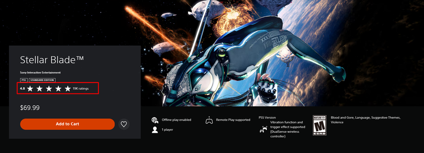 Nie zapominajmy też, że PlayStation Store również posiada oceny graczy. Obecnie Stellar Blade może pochwalić się wynikiem 4,8 na 5 punktów.
