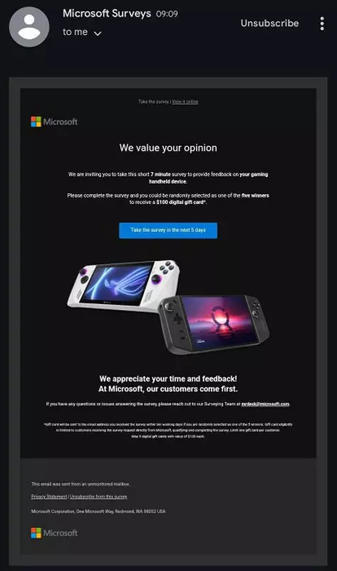 Wiadomo, że subskrybenci newslettera Microsoftu otrzymują drogą mailową ankietę dotyczącą przenośnych konsol. Firma jest zainteresowana tym, czy gracze korzystają z takich urządzeń, jakich producentów preferują, czy konsola powinna natywnie uruchamiać gry, czy wystarczy granie w chmurze, jakie czynniki wpływają na wybór konsoli, jaki powinien być jej rozmiar i wiele więcej.