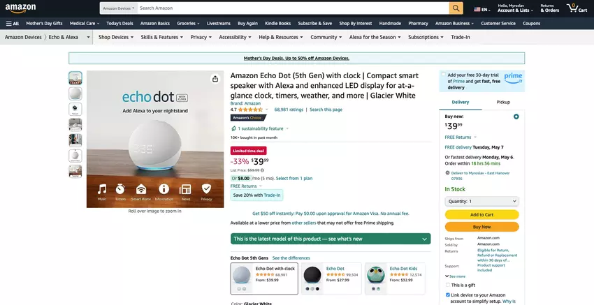 Amazon obniża cenę Echo Dot 5 Gen: inteligentnego głośnika z wbudowanym zegarem i Alexą za 39 USD