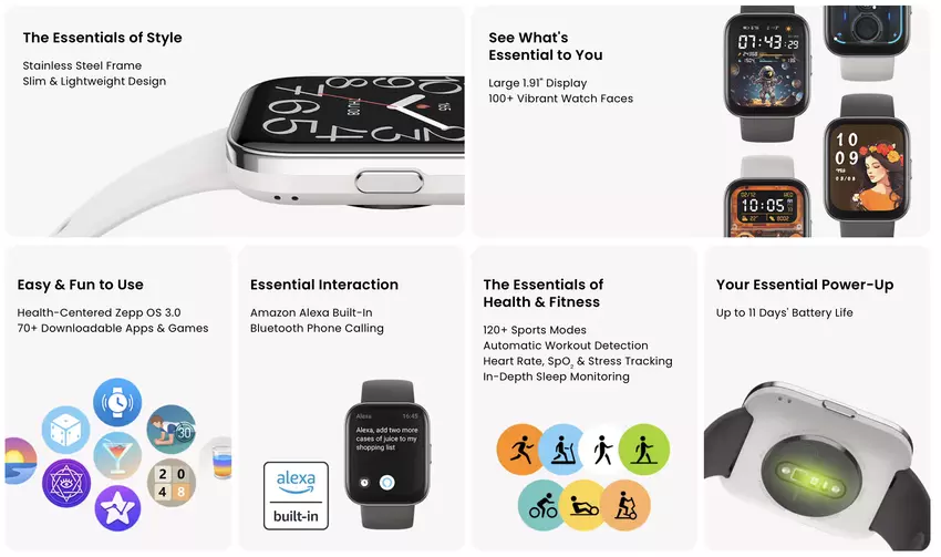 Smartwatch jest wyposażony w czujnik biometryczny Amazfit BioTracker PPG, który monitoruje tętno i poziom tlenu we krwi. Czujnik ostrzega również o nieprawidłowym tętnie, wysokim poziomie stresu lub niskim poziomie tlenu. Amazfit Bip 5 Unity obsługuje ponad 120 trybów sportowych. Ponadto nowość posiada asystenta głosowego Amazon Alexa.
