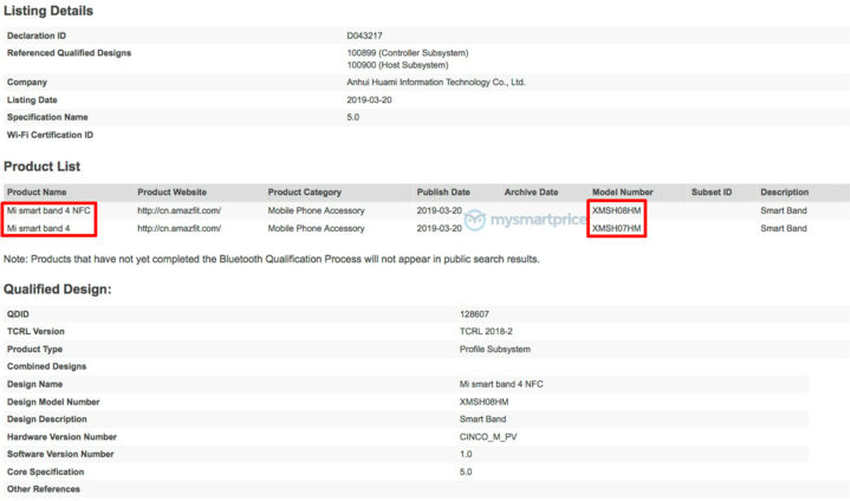 Dwa modele urządzeń przeszły Bluetooth certyfikowanie pod nóerami i XMSH08HM XMSH07HM. Niestety, dokumenty nie określają ich właściwości, ale część informacji jednak jest. Wersja nowej bransoletki będą się różnić obecnością NFC chip, a także zeszłoroczny modelu Mi Band 3. Będą one wyposażone w technologię Bluetooth 5.0 (przy okazji, już jest Bluetooth 5.1). Produkcja fitness trackera jak i przed tym zajmuje się spółka Anhui Huami Information Technology Co. Ltd (Huami).