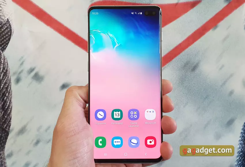 Smartphon jak i dotychczas wykonany ze szkła i metalu. Istnieje opcja ceramiczne, ale nie jestem pewny, że dostanie się on na nasz rynek. Ale kształt obudowy nieco się zmienił , wyświetlacz stał się większy a ramka - mniejszą. Ze względu na fakt, że teraz sprzodu stoi kamera (ona Galaxy S10 + zdwojona) jest osadzona bezpośrednio na wyświetlacz, Samsung nazwał taką budowę wyświetlacza Infinity-O. Jest wykorzystywany polepszony wyświetlacz AMOLED, które, według twórców, ma jeszcze lepsze odwzorowanie kolorów, nawet wyższą jasność szczytowa i obsługuje standard HDR10 + (główna kamera jest w stanie filmować odpowiedni film). Rozdzielczość 3040 x 1440, proporcje - 19: 9, boki są zakrzywione. Zamiast dwóch tylnych kamer z tyłu są teraz całe trzy. Dla „zwykłych” zdjęć, 2-krotny zoom, rozmycie tła i szerokokątnych zdjęć. Wewnątrz - nowy procesor ośmiurdzeniowy 8-nanometrowy procesor Exynos 9820, z częstotliwością zegara 2,73 GHz, 8 GB pamięci RAM 128 i GB pamięci wewnętrznej (w wersji podstawowej). Skaner linii papilarnych przeniesiony bezpośrednio pod ekran, a skaner tęczówki zniknął, pozostało tylko rozpoznawanie twarzy właściciela. Bateria się zwiększyła do 4100 mAh, która jest obsługiwana przez szybką ładowarkę przewodową i bezprzewodową, a także jest funkcja odwrotnego ładowania bezprzewodowego. To nie jest zbyt praktyczne do ładowania innego smartfonu, ale dla bezprzewodowych słuchawek Samsung Galaxy Buds jest bardzo przydatna.