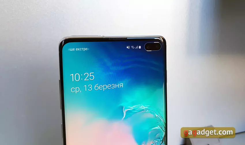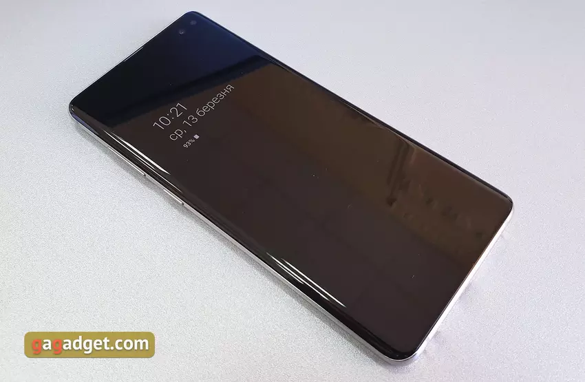 W smartphone ustawiony 6,4 calowy Infitity-O Dynamic AMOLED ekran z zakrzywionymi bokami, współczynnik stron 19: 9, zaokrąglone narożniki. Rozdzielczość jest 3040x1440 i gęstość pikseli - 522 ppi. Wyświetlacz obsługuje standard rozszerzonego dynamicznego zakresu HDR10 +, ogłoszona szczytowa jasności 800 cd / m2. Mimo że to jest bardzo specyficzne pojęcie: krótki pik na małym obiekcie w krótkim okresie czasu. Plus, wyświetlacz dostosowuje jasność do oświetlenia i przy jasnym słońcu jasność będzie wyższa. Nawiasem mówiąc, przednia kamera jest używana jako czujnik jasności.