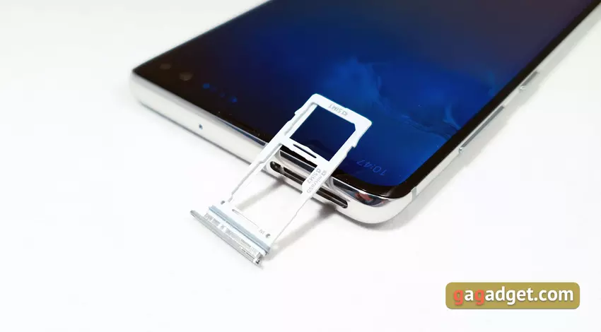 Kształt smartphone stał się nieco bardziej „prostokątny” w porównaniu do Galaxy S9 / S9 +, bliżej do Galaxy Note9. Powyżej wyświetlacza - mały otwór dla rozmownego głośnika. Ekran, oczywiście, z zakrzywionymi bokami, jest tradycyjna funkcja Always-On-Display: