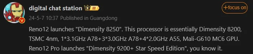 Informator dodał również, że Reno 12 Pro może być wyposażony w Dimensity 9200+, który może być sprzedawany jako Dimensity 9200+ Star Speed Edition. W związku z tym oczekuje się, że Reno 12 Pro zostanie uruchomiony z Dimensity 9200 + SoC.